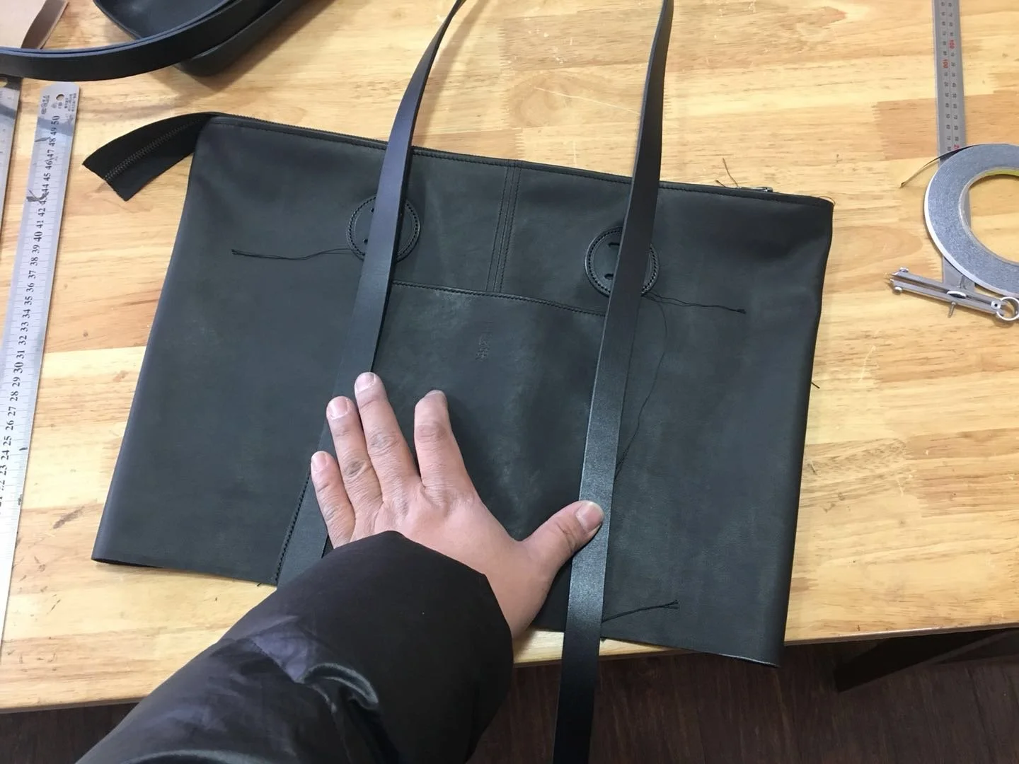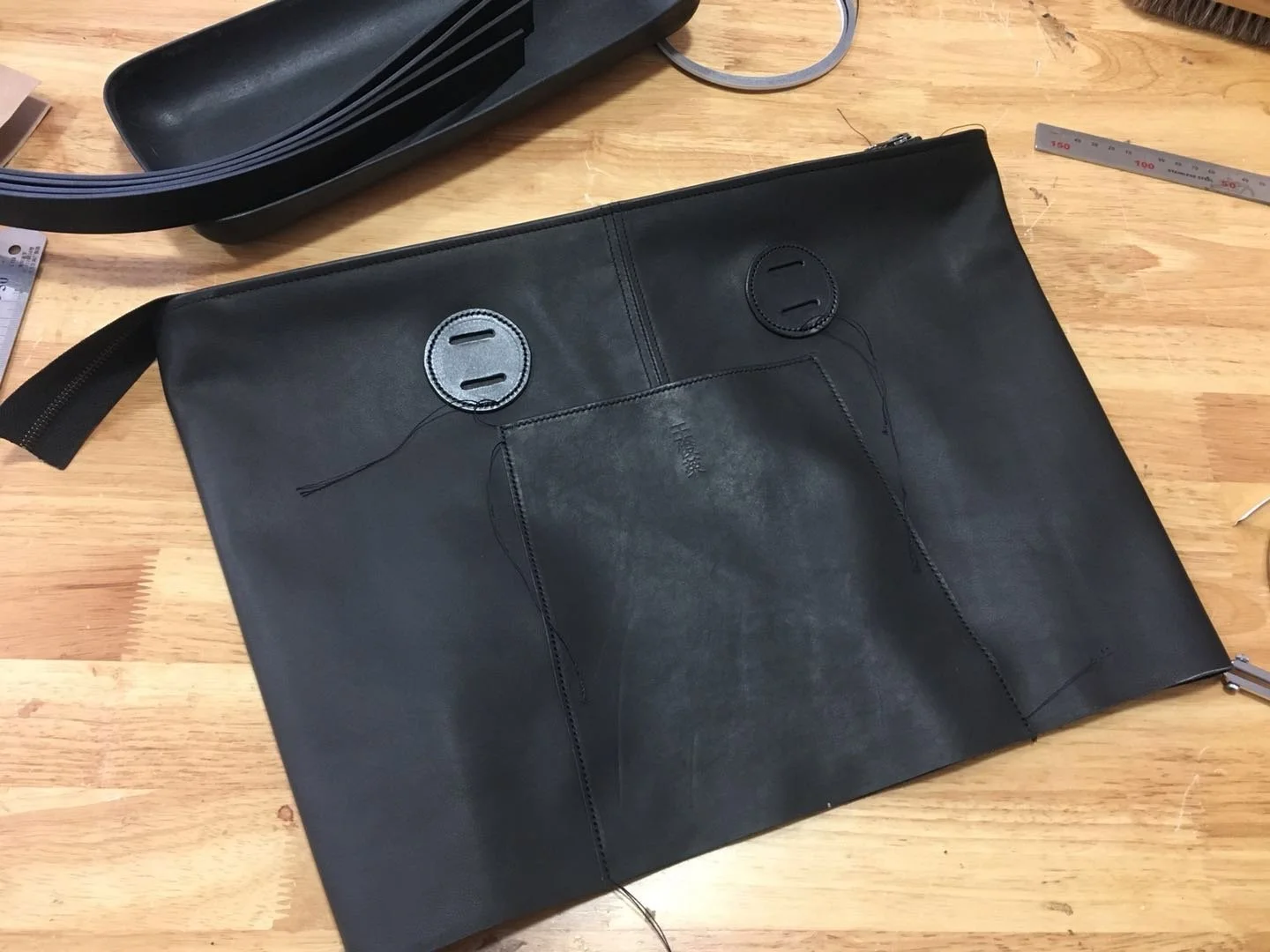 Le produit final commence, deux patchs circulaires viendront renforcer le point ou la sangle subira du stress. Ce renfort technique est également un marque esthétique du design du sac.